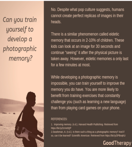 A photographic memory and a total recall is an ability to recall an image from a picture with high precision at least for a brief period of time after seeing it at once.